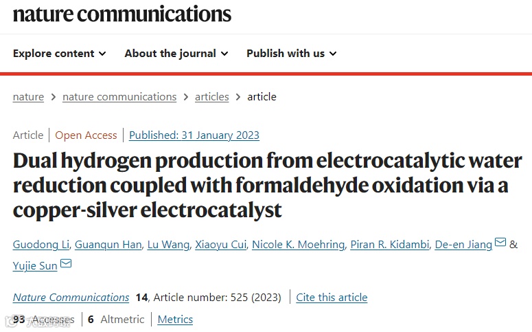 电解水制氢被广泛认为是生产清洁氢气的有效技术。然而由于阳极动力学缓慢的OER反应,该技术的大规模利用面临着需要较高电压和较低的能量转化效率的问题。有鉴于此,辛辛那提大学孙宇杰团队报道了一种有效的策略,利用热力学上更有利的甲醛部分电氧化反应来取代OER,进而耦合水还原实现较低电压下表观法拉第效率200%的阴阳两极同时制氢。