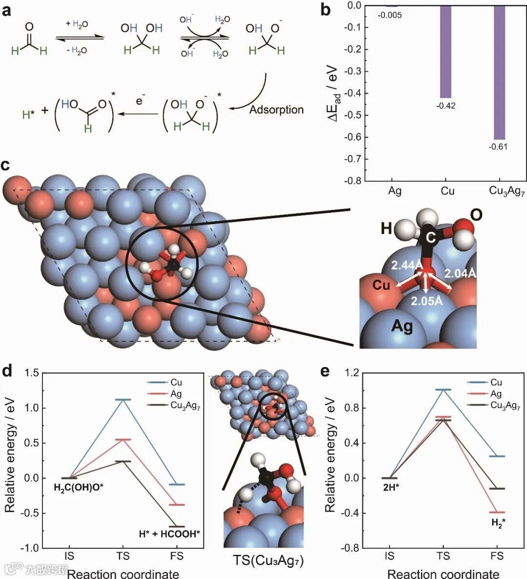 (4)理论计算:DFT计算表明甲醛生成的H2C(OH)O中间体在Cu3Ag7催化剂上的吸附稳定性比Cu或Ag催化剂上更高,Cu3Ag7上的C-H裂解要比在Cu或Ag上更有利进行。C-H裂解后,在Cu3Ag7上从两个H*也更容易形成H2。