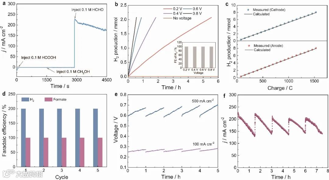在0.8 V电压下进行电解(图4c),对比阴极和阳极室的测量H2量与理论H2量,几乎完全一致,这表明了阴阳两极都实现了100%法拉第效率的制氢,整体达到表观200%法拉第效率制H2。此外,通过检测液体产物发现阳极也实现了法拉第效率100%的甲酸盐生产。同时量化对比甲醛电氧化反应前后的结果,表明HCHO的碳平衡保持100%。