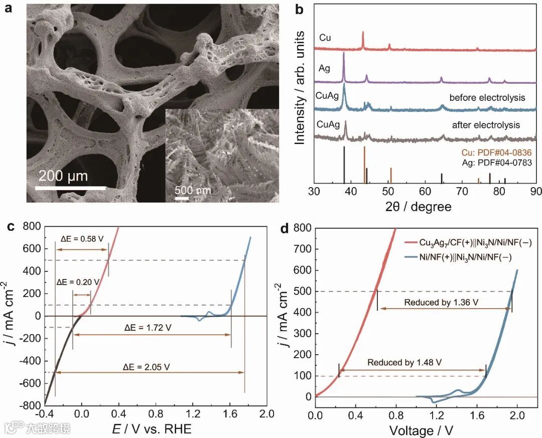 (2)电解性能测试:我们随后将Cu3Ag7电沉积在高多孔和高导电的基底上进行电解研究。为了避免引入其他金属,采用市售的泡沫铜作为催化剂载体和集流体。利用电沉积方法在泡沫铜(CF)上制备Cu3Ag7(详见原文)。