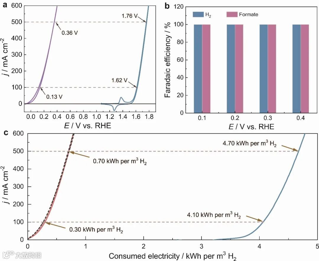 更重要的是,HCHO是低成本的化学原料,年产量大,而其氧化产物甲酸盐(或甲酸)也是更高附加值的化学品。此外,如果废水污染物中的有毒甲醛残留物作为原料,将FOR与HER结合起来制取H2,也可以产生环境效益。