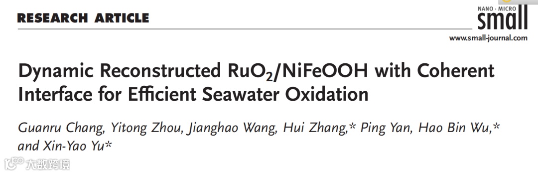 基于此,来自安徽大学遇鑫遥教授和浙江大学吴浩斌研究员的联合研究团队,在国际知名期刊Small上发表题为“Dynamic Reconstructed RuO2/NiFeOOH with Coherent Interface for Efficient Seawater Oxidation”的观点文章。本观点文章提出采用简单的一锅法制备RuO2纳米颗粒修饰的镍铁基金属有机框架(MOF)阵列(RuO2/NiFe-MOF)。