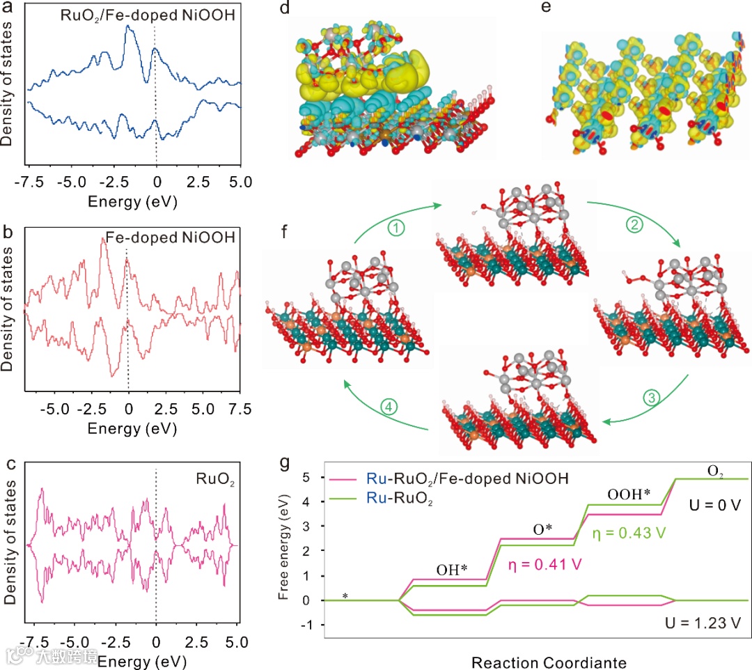 3 DFT理论计算证实了费米能级附近的活性电子增加以及从NiFeOOH到RuO2的电子转移可以提高OER活性,NiFeOOH和RuO2之间的强电子相互作用保证了RuO2的高稳定性。