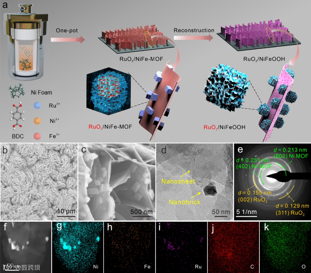 图1. RuO2/NiFe-MOF和RuO2/NiFeOOH的合成程示意图及RuO2/NiFe-MOF的表征分析