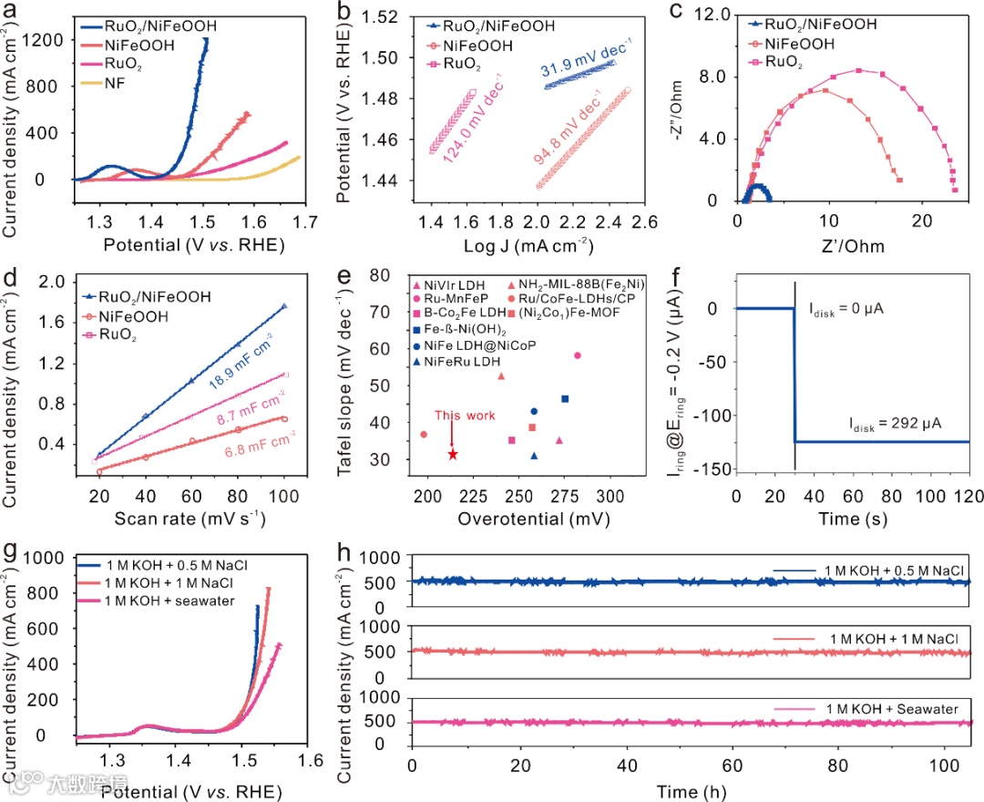 如图4所示,RuO2/NiFeOOH在氢氧化钾溶液,模拟海水以及实际海水中均展现了优异的电催化性能,明显优于RuO2和MOF重构的NiFeOOH。在1 M KOH中仅需要187.6 mV就能达到10 mA cm-2。在碱性实际海水中,RuO2/NiFeOOH只需要326.2 mV的低过电位就可以达到500 mA cm−2,其电催化性能优于大多数文献报道的镍铁基催化剂。同时,RuO2/NiFeOOH电催化剂在碱性海水中具有良好的耐受性,展示了在工业规模电流密度下实际电解天然海水的巨大潜力。