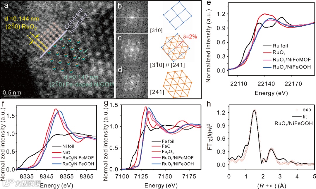 如图3所示,RuO2和NiFeOOH两相之间的界面是共格的,这种独特的共格界面不仅能促进电子转移,而且还保证了RuO2的良好稳定性。利用X射线吸收近边结构(XANES)和傅里叶变换扩展X射线吸收精细结构(FT-EXAFS)精细地表征了RuO2/NiFe-MOF重构前后的结构变化。重构后Ni的氧化状态高于Ni(II),铁则以Fe(III)的形式存在。相较于RuO2,RuO2/NiFeOOH的Ru-O和Ru-O-Ru键长缩短。与Ru-O键相比,Ni-O、Ni-O-Ni、Fe-O和Fe-O-Fe的键长都被拉长了,表明RuO2与NiFeOOH之间存在很强的相互作用,使得RuO2/NiFeOOH催化剂的OER的活性和稳定性得以提高。