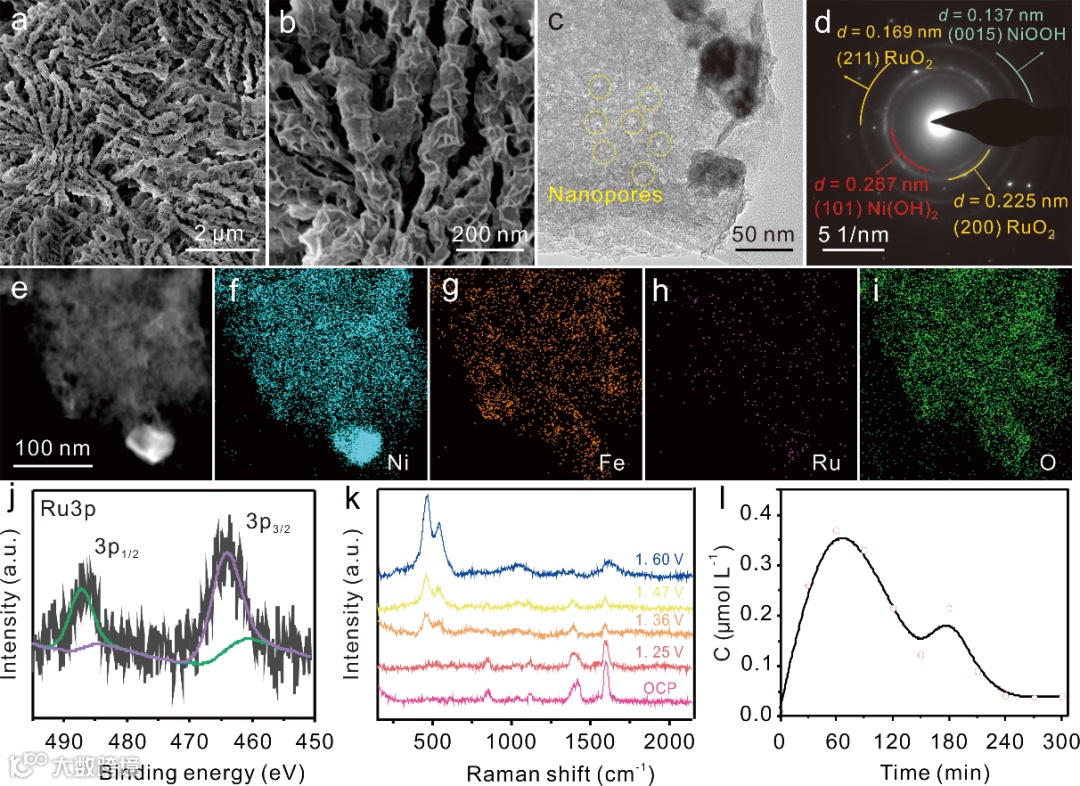 如图2所示,引入电场来触发RuO2/NiFe-MOF重构为RuO2/NiFeOOH,其仍保持阵列结构,但表面被卷曲的、超薄的纳米薄片密集地包裹着。纳米片上纳米孔众多,有望暴露更多的活性位点、增加催化剂和电解质之间的相互作用。有趣的是,Ru元素和Fe元素在整个阵列结构中均匀分布,表明在重构过程中伴随着Ru元素和Fe元素的溶解和再沉积。采用原位拉曼手段监测动态重构过程,证实重构过程中NiFe-MOF向NiOOH相的转变。