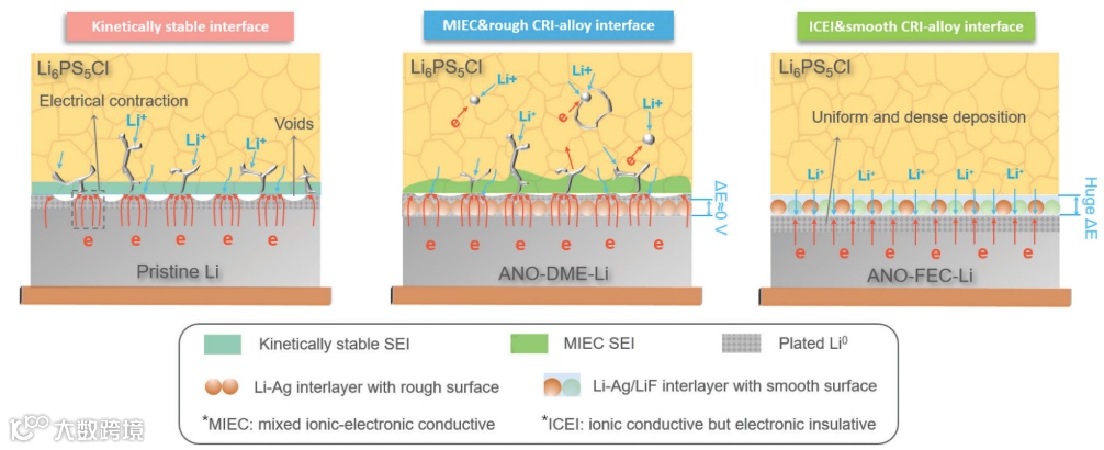 图7 不同性质的Li|Li6PS5Cl界面上的锂沉积和枝晶生长示意图