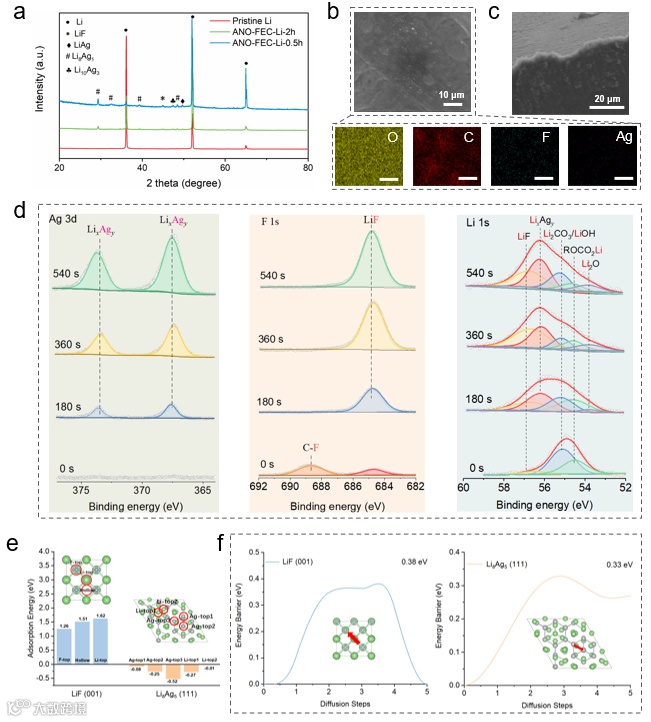 图3 AgNO3-FEC-Li负极的表征与计算。(a)XRD图谱;(b,c)SEM和EDS图;(d)Ag 3d、F 1s和Li 1s的纵深XPS图;(e)LiF和Li8Ag5不同位点对Li+的吸附能计算;(f)LiF(001)和Li8Ag5(111)内锂扩散能垒的DFT计算结果