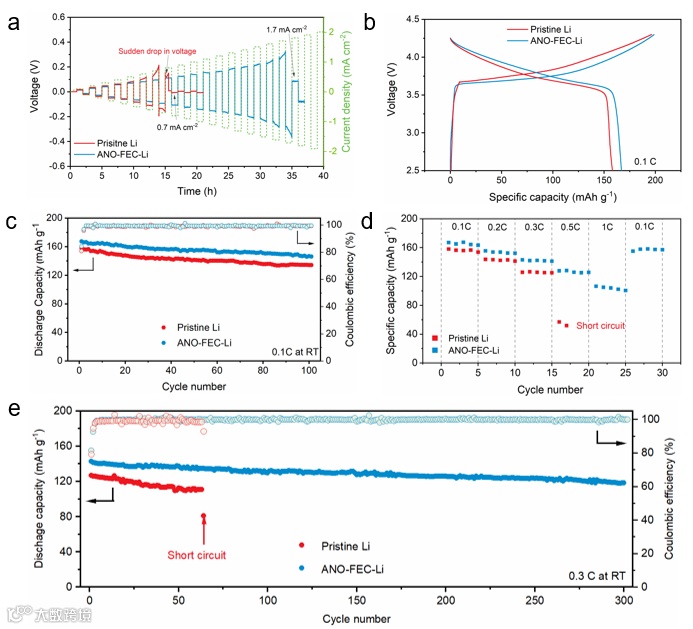 图5 (a)锂对称电池的CCD测试结果;(b-e)全电池的电化学性能