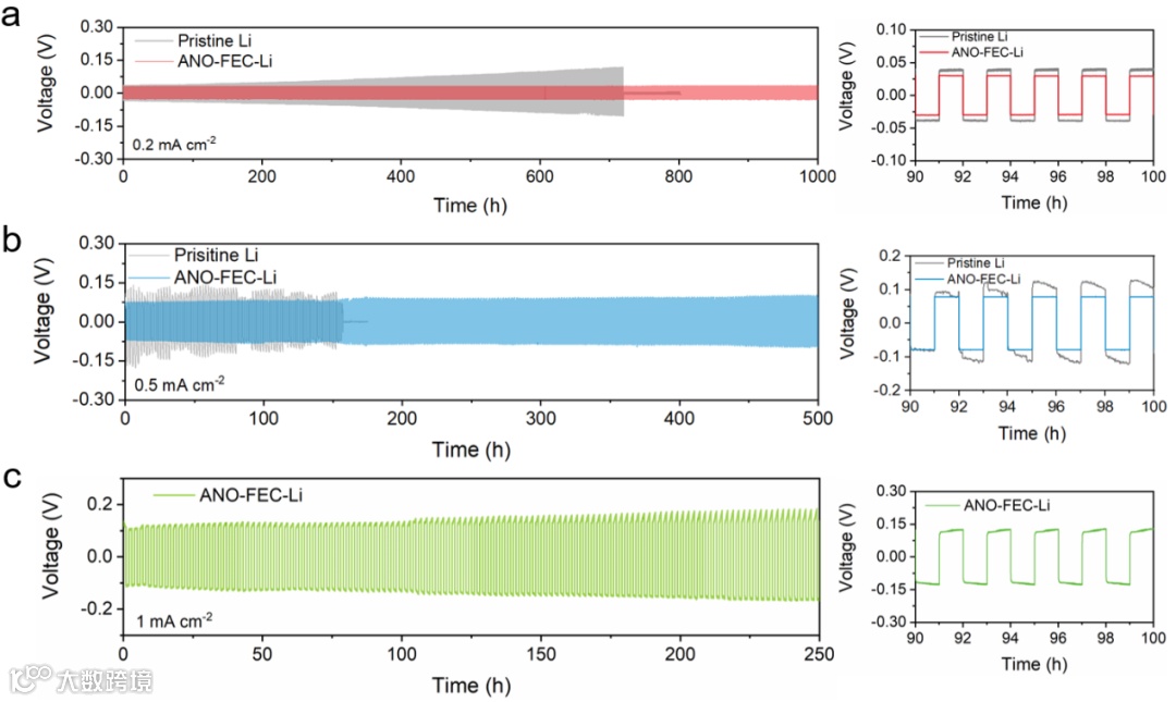 在首次沉积2 mAh cm-2的锂后,原始Li负极表面由于缺乏活性锂沉积位点,导致电极表面显示出混乱、不均匀的锂沉积形貌;而ANO-FEC-Li在首次沉积过程后仍保持光滑、无枝晶的形貌,类似于其初始状态,且锂沉积在合金层下方。在全电池循环完成后,原始锂负极与固态电解质界面沉积的锂呈多孔的蜂窝状,这会导致锂的粉化和界面的接触失效。相比之下,ANO-FEC-Li负极表面沉积的锂致密且平滑,在循环300次后,仍能保持界面的机械完整性。