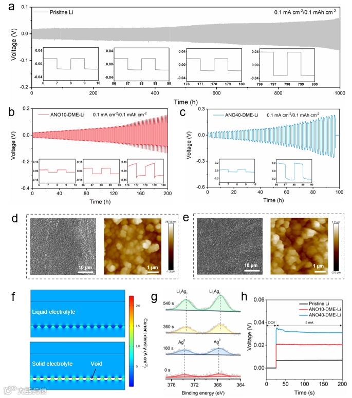 图1 AgNO3-DME溶液中制备的CRI合金层在固态电池中的评估。(a)原始Li、(b)ANO10-DME-Li和(c)ANO40-DME-Li的对称电池锂沉积/剥离电压-时间曲线;(d)ANO10-DME-Li和(e)ANO-DME40-Li电极的SEM和AFM图;(f)液态电池和固态电池中界面空隙处局部电流密度的COMSOL模拟图;(g)ANO10-DME-Li表面Ag 3d的纵深XPS图;(h)不同锂负极的电子电导率测试图
