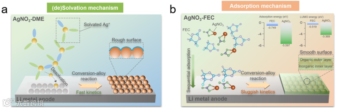 在超低浓度的AgNO3-FEC溶液中,Ag+的溶剂化程度减弱,使溶液中的溶解-沉淀平衡向左移动,意味着AgNO3更容易通过表面吸附的方式与金属锂相互作用,而不是通过溶剂化鞘的方式。因此,置换-合金反应的动力学过程在AgNO3-FEC溶液中被显著抑制。此外,DFT计算表明AgNO3和FEC的LUMO能级水平和对Li的吸附能展示出较大的差异,意味着AgNO3和FEC在金属锂表面依次吸附和还原,形成梯度分层的有机-无机CRI合金保护层。