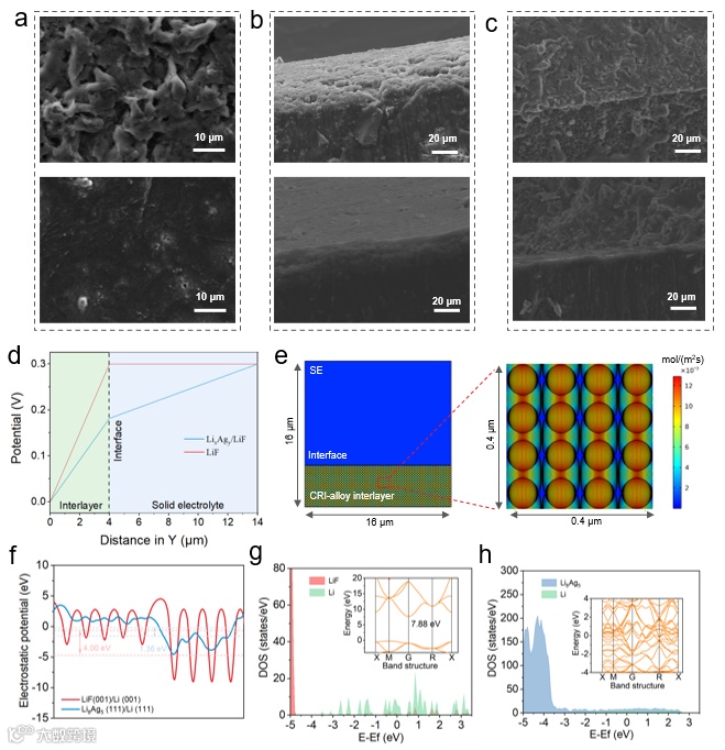 图6 首次沉积2 mAh cm-2后,锂负极的(a)表面和(b)截面SEM图;(c)全电池循环后电解质层和锂负极之间界面的SEM图;(d)LiF和LixAgy/LiF中间层界面的电势分布情况;(e)LixAgy/LiF保护层中离子束流分布的COMSOL模拟结果;(f-g)LiF和LixAgy/LiF保护层的电子性质计算结果