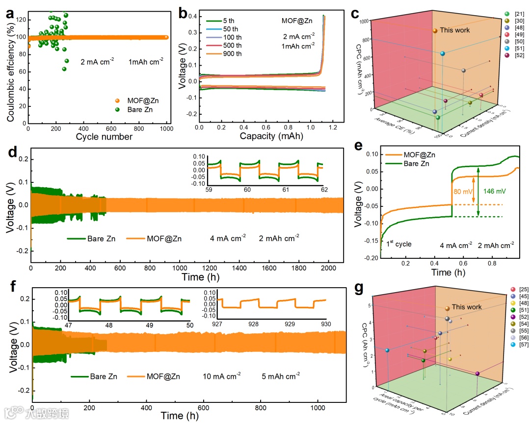 MOF@Zn||Cu非对称电池的平均库伦效率高达99.2%,同时锌的可逆沉积/溶解可以达到1000次,累计沉积比容量为800 mAh cm-2(图3a-c)。相反,Zn||Cu非对称电池循环90圈后出现剧烈波动并失效。这表明MOF界面层能够有效提高锌负极的循环可逆性及寿命。基于此,MOF@Zn||MOF@Zn对称电池可以支撑10 mA cm-2大电流密度下1100 h的稳定循环,并实现高达5.5 mAh cm-2的累计沉积比容量(图3f)。该性能与已报道的改性锌负极相比处于领先地位(图3g)。