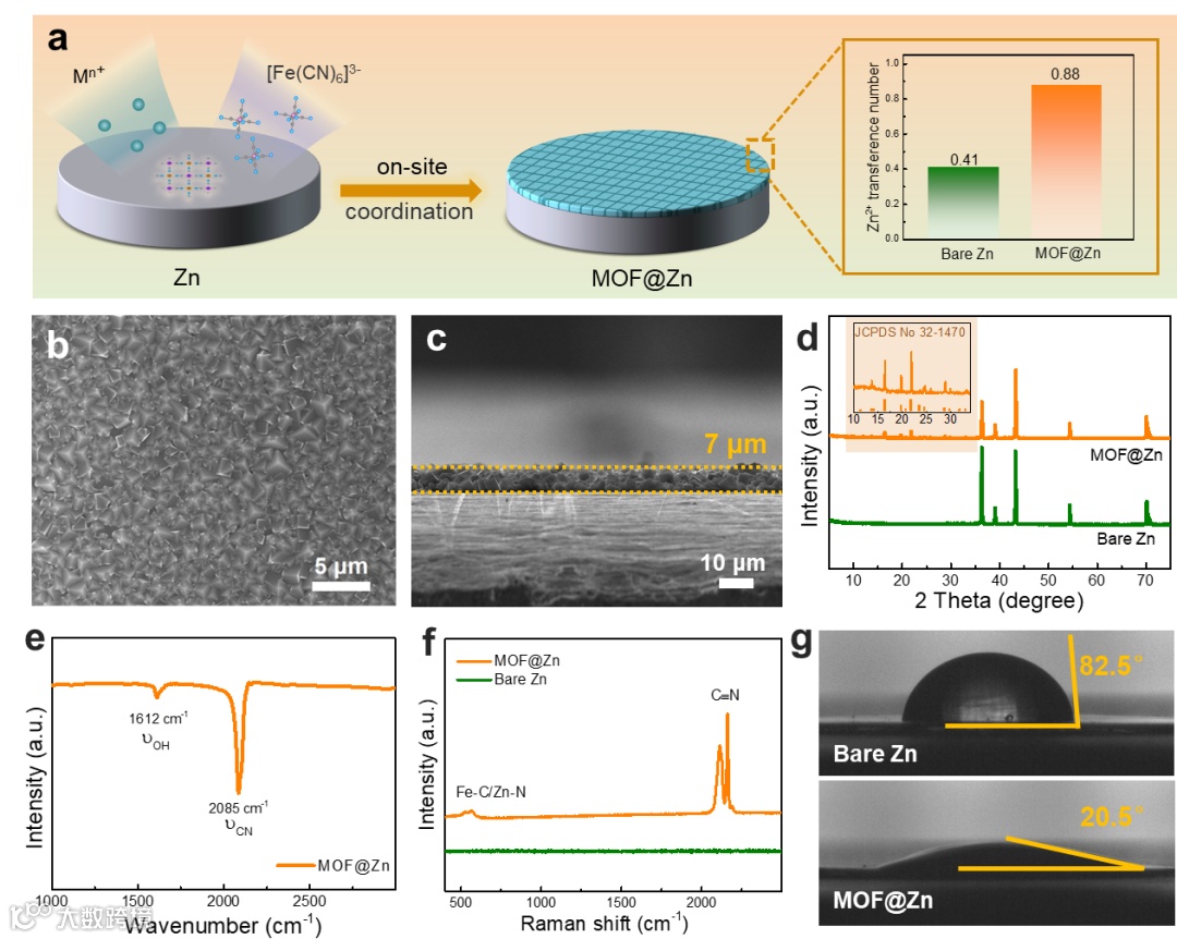 基于金属离子和Fe(CN)6-的配位作用实现了无缝多功能MOF界面层的快速合成(图1a)。弱酸性条件下,Zn箔被刻蚀并释放Zn2+,固-液界面处Zn2+浓度升高,并与溶液中Fe(CN)6-配位后在Zn箔表面原位形成MOF层。SEM、XRD、FT-IR和Raman结果证明了MOF界面层的成功修饰(图1b-f)。此外,MOF显著增强了电极表面润湿性,说明三维开放MOF层能够诱导电极/电解质界面处Zn2+的快速扩散。