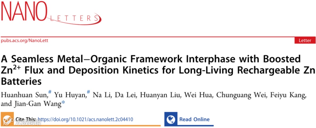 基于此,西北工业大学王建淦教授课题组,在国际纳米领域顶级期刊Nano Letters 上发表题为“A Seamless Metal-Organic Framework Interphase with Boosted Zn2+ Flux and Deposition Kinetics for Long-Living Rechargeable Zn Batteries”的研究论文。