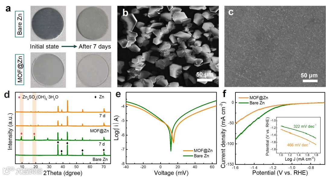 研究了纯Zn和MOF@Zn负极在电解液中浸泡一周之后的表面形貌结构变化。浸泡后,纯Zn电极表面金属光泽暗淡,转变为银灰色(图2a),而MOF@Zn保持较好。SEM、XRD和腐蚀测试进一步证明了MOF界面层能够有效缓解Zn负极表面腐蚀(图2b-e)。LSV曲线和对应的Tafel斜率证明MOF@Zn表面析氢反应动力学相比于纯Zn明显下降(图2f)。以上研究表明,MOF中间层能够有效抑制Zn负极表面副反应的发生,包括腐蚀和析氢。