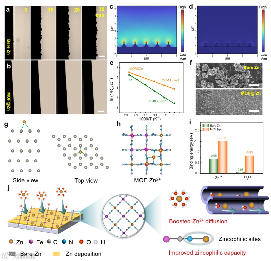 Figure 4. In situ optical micrographs of Zn deposition on (a) bare Zn and (b) MOF@Zn at a current density of 5 mA cm-2 (scale bars: 50 µm). Simulated electric field distribution for Zn deposition on (c) bare Zn and (d) MOF@Zn anodes. (e) Arrhenius curves of bare Zn and MOF@Zn. (f) Top-view SEM images of Zn deposition on the bare Zn and MOF@Zn at 1 mA cm-2 for 1h (scale bars: 50 µm). (g) Top-view and side-view computational model of Zn atom on Zn substrate. (h) Top-view structure model of Zn atom on MOF substrate. (i) The binding energy of Zn and H2O absorbed on Zn and MOF substrate. (j) Schematic Zn2+ deposition on MOF@Zn electrode.