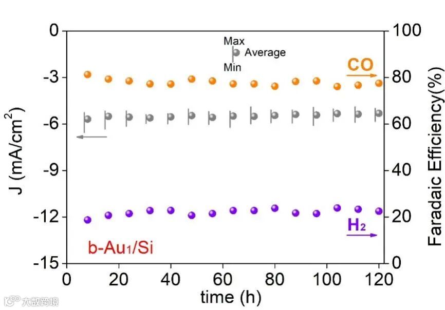 通过稳定性测试证明:b-Au1/Si光阴极在-0.4 VRHE的测试下稳定工作120h后的催化活性以及对CO的选择性均没有明显衰减,这得益于Au NPs的稳健双相结构和Au与Si界面之间的紧密接触。