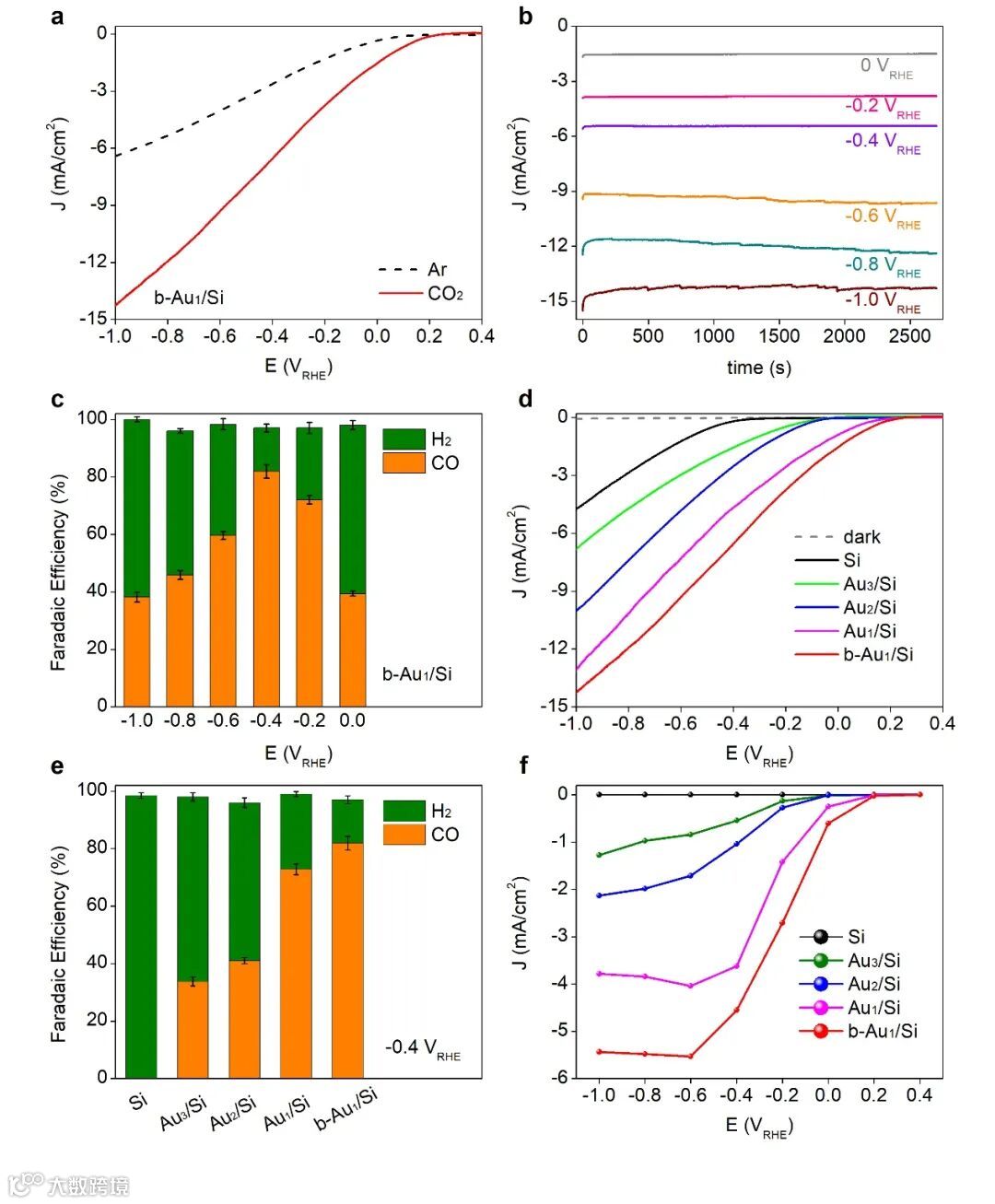 此外,通过进一步嵌入Au NPs,我们的b-Au1/Si光电阴极不仅提高了PEC活性和CO生成的选择性,而且极大地提高了操作稳定性,这可以归因于Au/Si界面的紧密接触。最终,优化的Si光电阴极在−1.0 VRHE时实现了−13.1 mA cm−2的光电流密度,法拉第效率高达82.2%,稳定性超过120 h。这项工作中的面工程为太阳能驱动燃料生产中更高效、选择性和稳定的光电阴极的制造提供了新的策略。