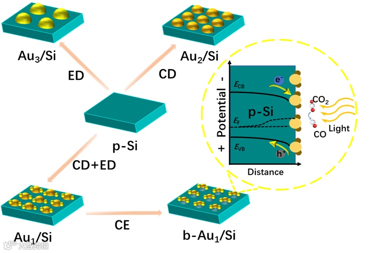 光电化学 (PEC) CO2 还原作为一种能够将间歇性的太阳能转化为可储存的碳基燃料的策略,对于解决全球能源危机和全球变暖具有巨大的经济和环境价值。半导体Si具有低成本、窄带隙、储量丰富以及合适的能带结构等优势,是极具潜力的PEC光电极材料。然而,由于Si 光阴极本身就存在较差的催化活性和对 CRR 的选择性,需要额外的表面助催化剂需要调节表面反应动力学。