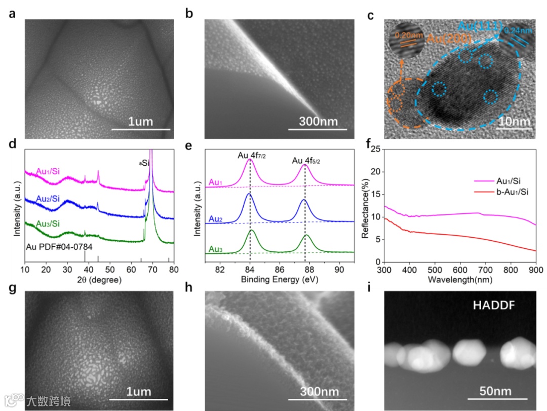 Fig. 2. Characterization of the as-prepared Si photocathodes. (a) Top-view, (b) cross-section SEM images and (c) high-resolution TEM image of Au NPs from the Au1/Si sample. (d) XRD patterns and (e) high-resolution XPS Au 4f spectra taken on the Au1/Si, Au2/Si and Au3/Si photocathodes. (f) Reflection spectra of the Au1/Si and b-Au1/Si photocathodes. (g) Top-view, (h) cross-section SEM images and (i) HAADF image of b-Au1/Si.