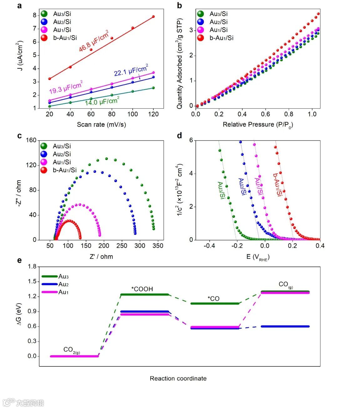 Fig. 4. PEC analyses on the charge transfer kinetics and CRR mechanism. (a) current density plots at various scan rates, (b) CO2 adsorption-desorption isotherms, (c) EIS spectra and (d) Mott–Schottky plots of various Si photocathodes. (e) DFT calculated free energy diagrams for CO2 reduction to CO on the Au(111), Au(200) surfaces and the Au(111)/Au(200) junction.