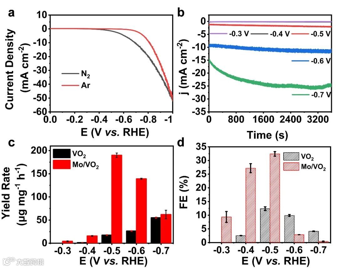 该研究采用氮气吸附能力比H吸附能力更强的VO2作为载体,用于提供N源以及抑制H的吸附。然而此类材料对氮气的活化能力较弱,导致第一步加氢能垒过高,从而引起高电位下的HER发生。于是引入具有高NRR活性的Mo作为促进NRR的活性位点。同时,通过载体与Mo之间的电子金属-载体相互作用(EMSI),在金属上形成路易斯酸位点,进一步削弱负载金属对H吸附,降低了质子化第一步的能垒,从而在动力学上增强了NRR活性。在−0.5 V vs RHE时,Mo/VO2的平均NH3产率为190.1 μgNH3 mgcat.-1 h-1,法拉第效率为32.4%,分别是VO2的10.8倍和2.8倍。因此,本研究为高效电催化N2还原催化剂的设计和开发提供了一种新的策略。