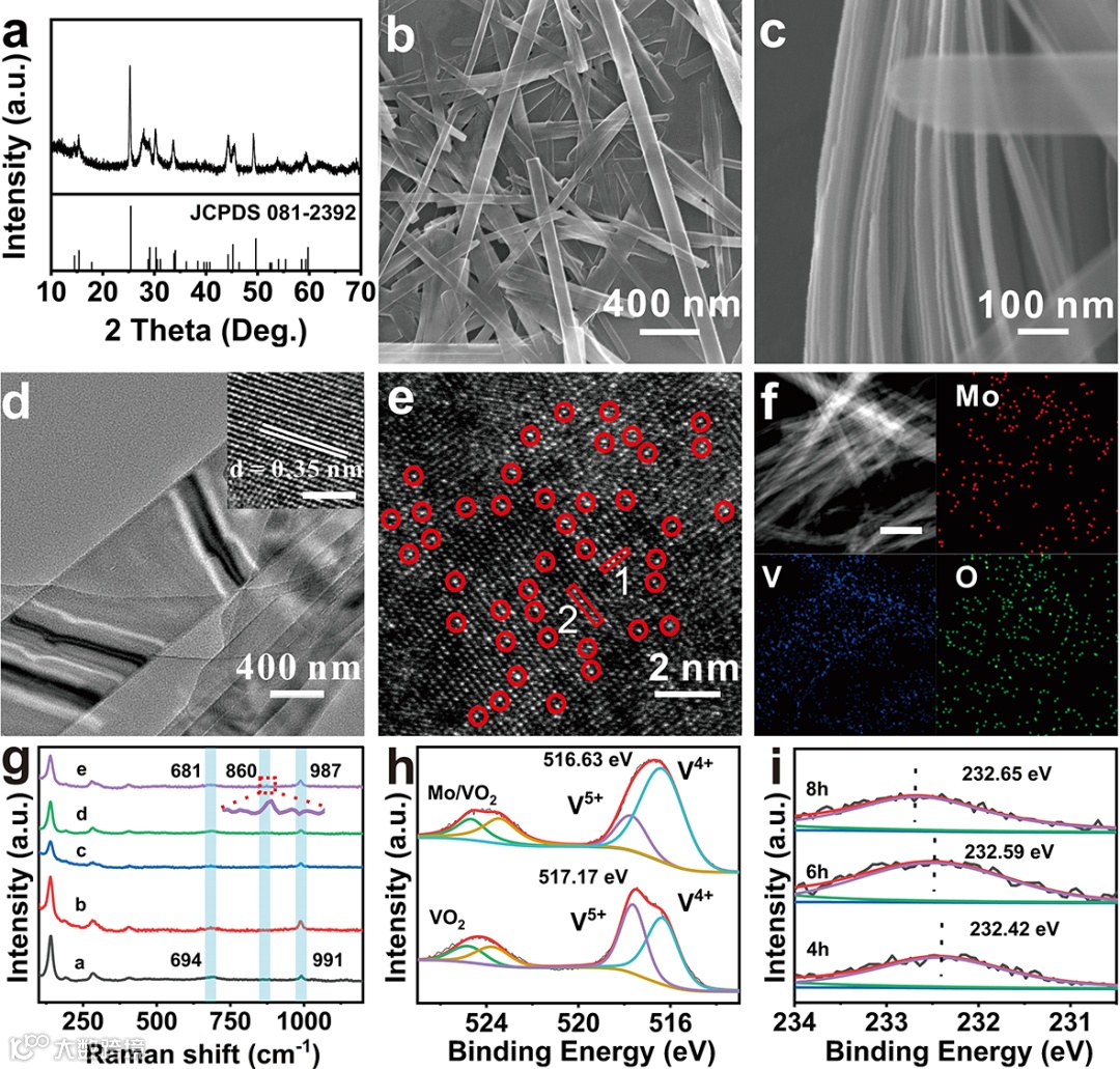 Figure 1. Characterization of Mo/VO2. a) The XRD pattern of Mo/VO2. b), c) SEM images. d) TEM image and corresponding HRTEM image. e) AC-HAADF-STEM image of Mo/VO2 distribution (the interior highlights represent the successful introduction of Mo). f) STEM-EDS mapping images. g) Raman comparison of Mo/VO2 and VO2 (a-e Mo = 0, 4%, 6%, 8%, 10%). h) V XPS in Mo/VO2 and VO2 Comparison. i) XPS spectra of Mo for Mo/VO2-4, Mo/VO2-6 and Mo/VO2.