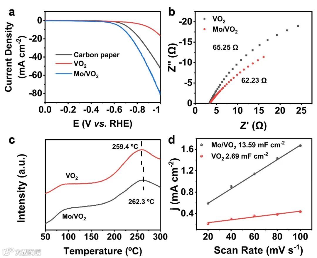 Figure 3. Effects of Mo doping on catalytic performance. a) The LSV curves of Mo/VO2 and VO2 measured at a scan rate of 10 mV s−1 under the N2 atmosphere. b) Nyquist plots, and c) N2-TPD profiles for Mo/VO2 and VO2. d) FE of Mo/VO2 and VO2 at different potentials.