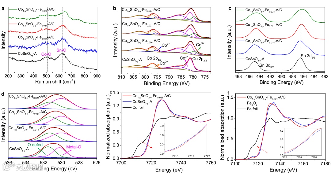 (2) 揭示了金属-氧键结构的调控机制。非晶态CoSnO3中晶体结构的引入主导了金属-氧键结构的剪裁,而Fe-O键和丰富钴缺陷的引入进一步促进了这一裁剪过程。