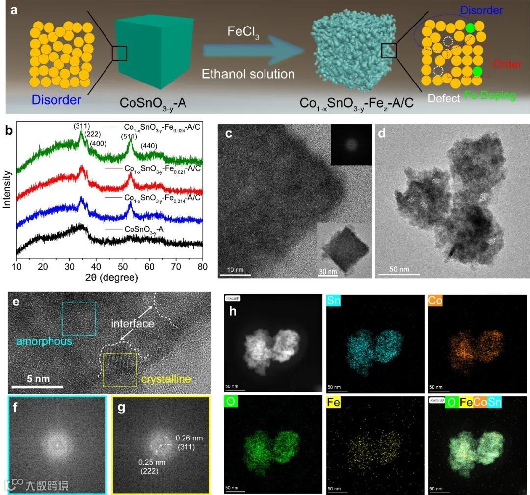 基于此,同济大学潘争辉教授和华南理工大学丘勇才教授等人(第一作者为博士生叶常春)报道了一种通过合理设计非晶/晶体异质结构裁剪金属-氧键的简易策略,并通过将非晶态CoSnO3-y立方体置于FeCl3乙醇溶液中进行离子交换来进行证明。离子交换过程强化了Sn-O键并削弱了Co-O键强度,并产生额外的Fe-O键,伴随丰富的Co缺陷和适当的氧缺陷浓度,最终形成了具有独特电子结构和配位环境的Fe掺杂非晶/晶体异质结构纳米催化剂(Co1-xSnO3-y-Fe0.021-A/C)。