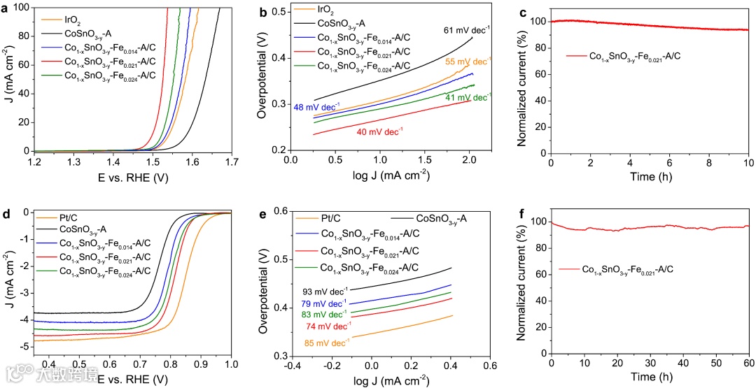 通过对比实验,发现金属-氧键结构的优化以晶体结构的引入为主,而Fe-O键和丰富Co缺陷的引入进一步促进了金属-氧键结构的优化。电化学测试表明,与初始无定形CoSnO3-y相比,Co1-xSnO3-y-Fe0.021-A/C催化剂的OER和ORR过电位分别显著降低84 mV (10 mA cm-1)和63 mV(半波电位)。此外,以Co1-xSnO3-y-Fe0.021-A/C为正极组装的锌-空气电池具有优异的输出功率密度、循环性能和灵活性。