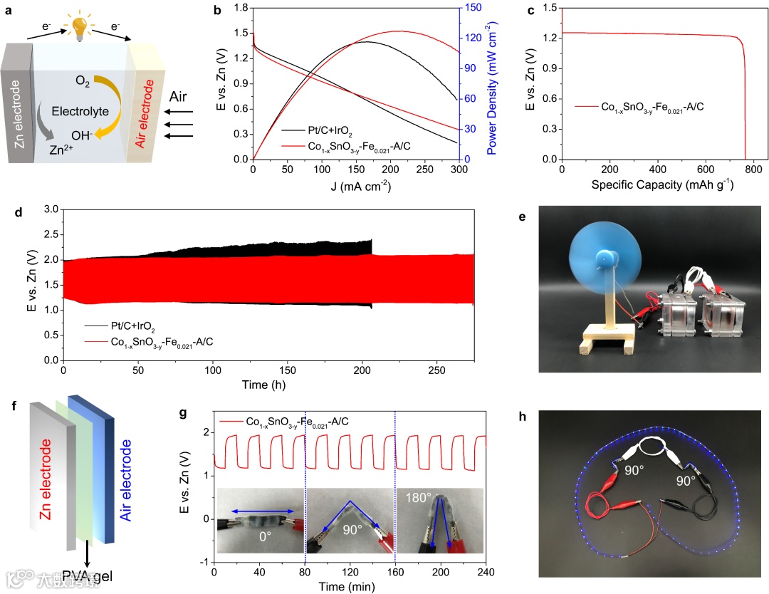 Figure 4: zinc-air battery performance. (a) Schematic of rechargeable liquid Zn-air battery configuration. (b) Polarization and power density curves of Co1-xSnO3-y-Fe0.021-A/C compared with Pt/C+IrO2 catalyst. (c) Galvanostatic discharge curve of the battery based on Co1-xSnO3-y-Fe0.021-A/C at 5 mA cm-2. (d) Cyclic stability of Zn-air battery at 5 mA cm-2. (e) Demonstration of two liquid ZABs in series to power a fan. (f) Schematic of flexible solid-state Zn-air battery. (g) Galvanostatic charge and discharge profiles under different bending angles at 2 mA cm-2. (h) Photograph of a flexible battery to drive LED lights.