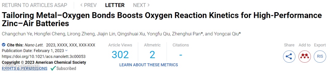 Ye, Changchun, et al. "Tailoring Metal–Oxygen Bonds Boosts Oxygen Reaction Kinetics for High-Performance Zinc–Air Batteries." Nano Letters (2023).