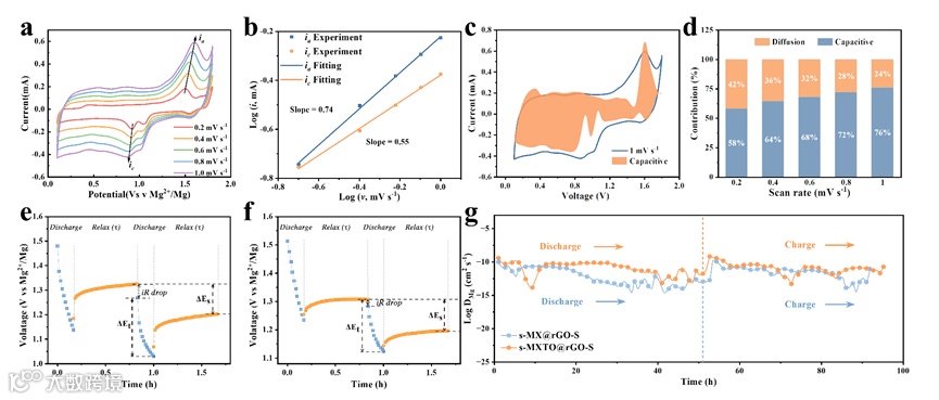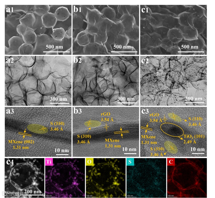 采用静电吸附和牺牲模板法构建三维MXene@rGO导电框架。这种独特的三维中空纳米球结构可以有效地防止MXene和rGO片材的堆积,大大增加材料的比表面积。MXene的高结构强度可以缓解充放电过程中S体积变化造成的结构损伤,从而防止空心球体结构坍塌,提高循环稳定性。具有高结构柔韧性的氧化石墨烯组成可以像蜘蛛网一样交联MXene空心球,缩短了电子/离子迁移路径,降低了离子迁移能垒,从而提高了电化学动力学和速率性能。