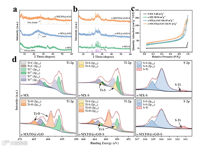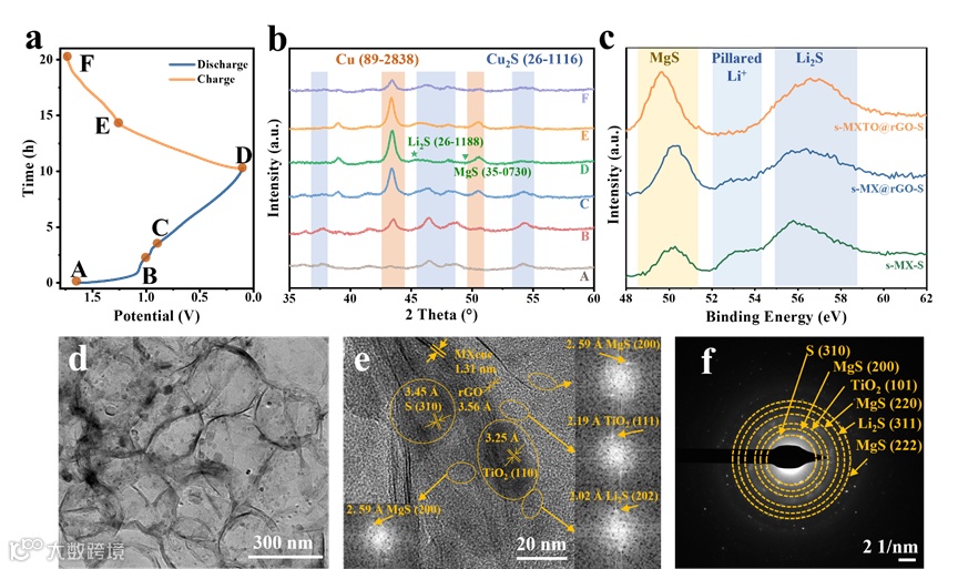 采用简单的原位氧化的方法在MXene和rGO界面层间生成的TiO2纳米颗粒。TiO2能够与硫和多硫化物形成Ti-S键,显著增强了多硫化物的吸附,并将其限制在导电框架内,从而缓解了“穿梭效应”。此外,通过分析反应产物物相并结合理论计算结果,我们发现在TiO2的催化作用下,多硫化物的转化活性进一步提高,从而提高了电化学容量和循环稳定性。