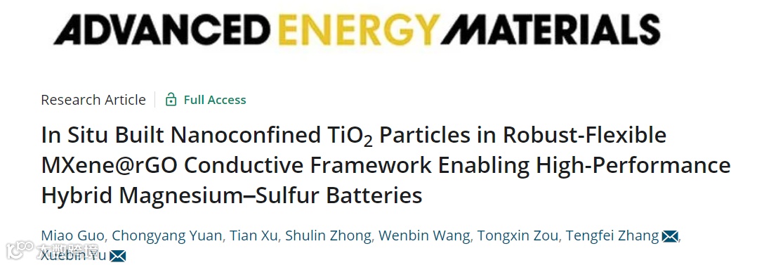 近日,来自复旦大学的余学斌教授和南京航空航天大学的张腾飞研究员合作,在国际知名期刊Advanced Energy Materials上发表题为“In Situ Built Nanoconfined TiO2 Particles in Robust-Flexible MXene@rGO Conductive Framework Enabling High-Performance Hybrid Magnesium–Sulfur Batteries”的研究文章。