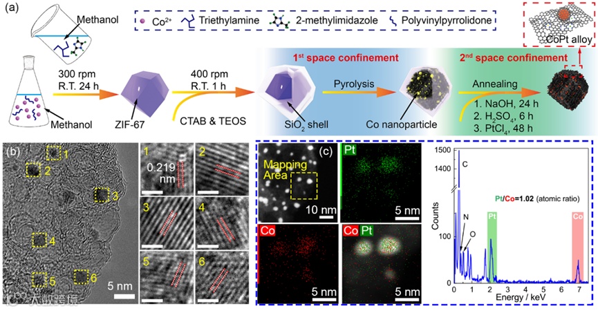 图1 (a)CoPt催化剂制备流程示意图,(b)CoZ-60Pt催化剂HR-TEM图,(c)CoZ-60Pt催化剂不同元素的mapping分析图