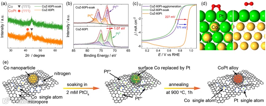 图3 CoPt催化剂退火前后的(a)XRD和(b)XPS图,(c)不同催化剂的LSV曲线,(d)不同Pt基金属表面对氧气分子的吸附示意图,(e)小尺寸CoPt纳米合金制备流程示意图
