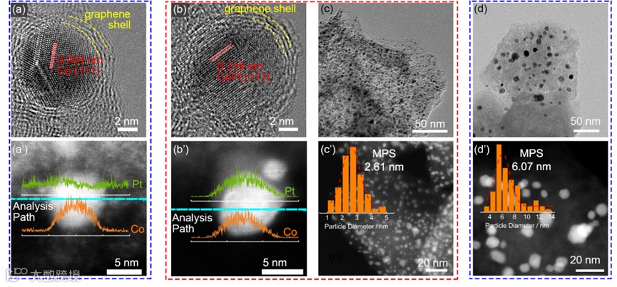 图2 (a)CoZ-60Pt催化剂退火前的HR-TEM图和元素线扫图,(b)CoZ-60Pt催化剂退火后的HR-TEM图和元素线扫图,(c)CoZ-60Pt催化剂粒径统计图,(d)没有石墨烯壳层保护的Pt基催化剂的粒径统计图