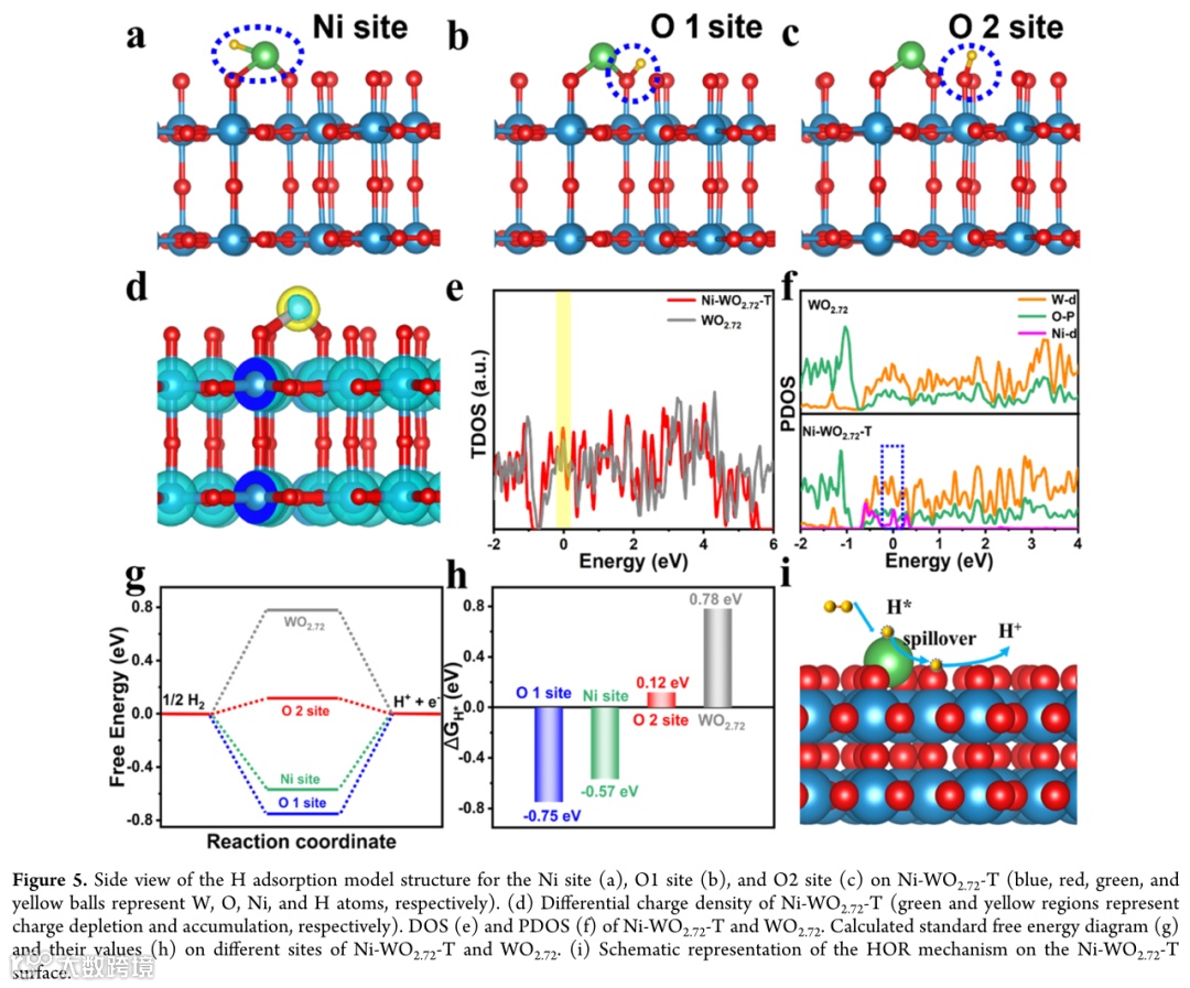 为了进一步研究HOR电催化机理和界面氢溢流效应,我们采用DFT计算方法分析了Ni-WO2.72-T和纯WO2.72的电催化热力学和动力学。Ni-WO2.72-T的TDOS的提升以及差分电荷计算表明Ni原子引入后电子结构得到了有效调控,电导率得到了提高。Ni-WO2.72-T上的O2位点(0.12 eV)的ΔGH*值近似接近于0 eV,说明H*吸附/解吸更为理想。