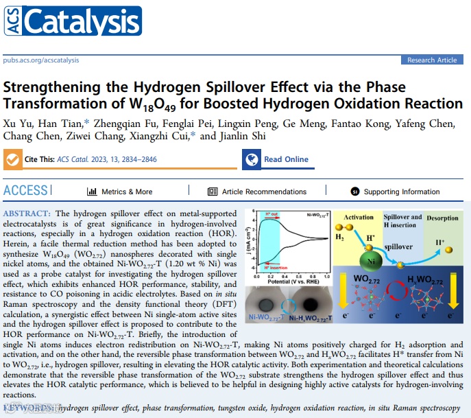 本工作创新性地提出一种在海胆状WO2.72上原位锚定单原子镍的工程学策略,并以此为模型催化剂来研究氢溢流效应。得益于原子分散的Ni单原子与WO2.72载体之间的电子相互作用,以及WO2.72和HxWO2.72之间可逆相变促进的氢溢流效应,所制备的Ni-WO2.72-T催化剂表现出显著增强的HOR催化活性、优异的稳定性和抗CO中毒性。在此基础上,我们借助原位拉曼、H2-TPR、DFT计算等技术,深入探究了氢溢流效应协同Ni单原子活性位点实现HOR性能提升的机理。