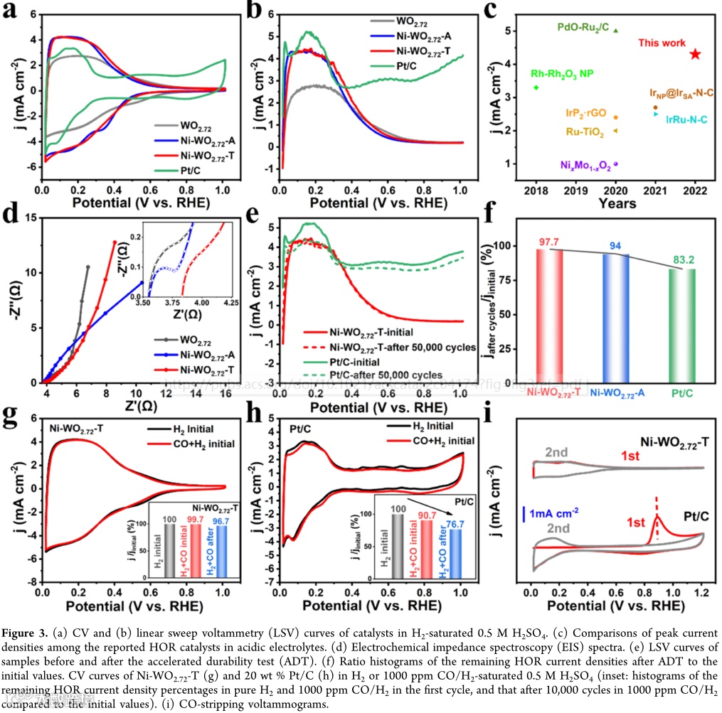在H2饱和0.5 M H2SO4溶液中,Ni-WO2.72-T(~4.3 mA cm-2)表现出远高于WO2.72(~2.7 mA cm-2)的HOR活性,略低于20 wt. % Pt/C(~5.2 mA cm-2)。在加速耐久性测试(ADT)中,50,000次循环后,相较于商业20 wt. % Pt/C 16.8%的衰减,Ni-WO2.72-T的HOR电流密度仅衰减2.3%,体现了较高的稳定性。在1000ppm CO/H2气氛中循环10000次后,相较于20 wt.% Pt/C超过20%的急剧衰减(相对于纯H2下的性能),Ni-WO2.72-T的峰值电流密度几乎没有明显的下降,表明其具有良好的抗CO中毒性能。