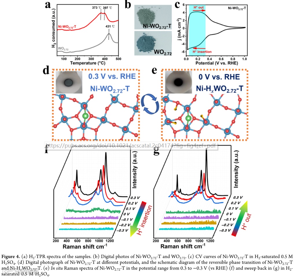 为了探究HOR催化机理,我们研究了Ni与WO2.72基体之间的相互作用以及WO2.72与HxWO2.72在HOR催化过程中的可逆相变。程序氢升温还原(H2-TPR)中Ni-WO2.72-T的主还原峰向较低温度的移动表明Ni原子与WO2.72载体之间可能存在氢溢流效应。同时,CV循环过程中随着电位的变化可以观察到催化剂可逆的颜色变化,这一现象应源于通过H+插入/插出行为而引起的WO2.72和HxWO2.72之间的可逆相变,可被原位拉曼特征峰的可逆变化强力验证。