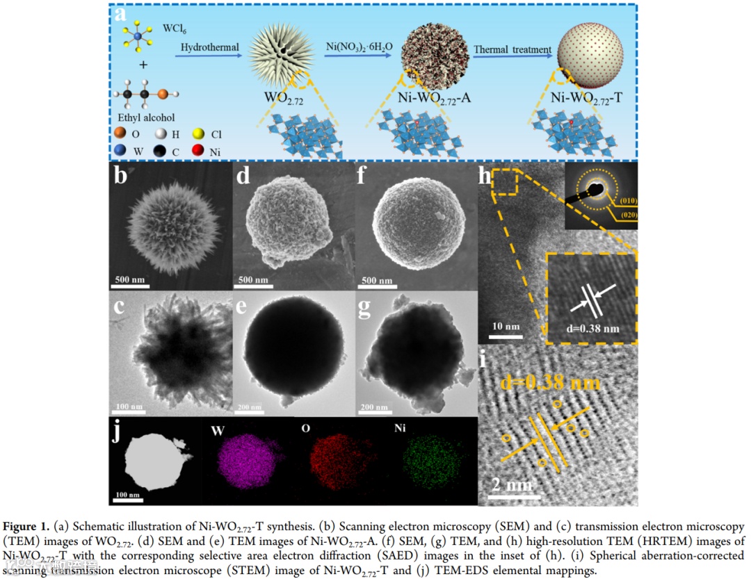 首先,我们利用醇热法制备了海胆状WO2.72纳米球并依次利用热还原和热处理的方法将Ni原子锚定在WO2.72纳米球上。从Ni-WO2.72-T的HRTEM图像和球差校正扫描透射电子显微镜(STEM)图像,验证了单斜相WO2.72的成功合成以及Ni原子均匀且孤立的分布。