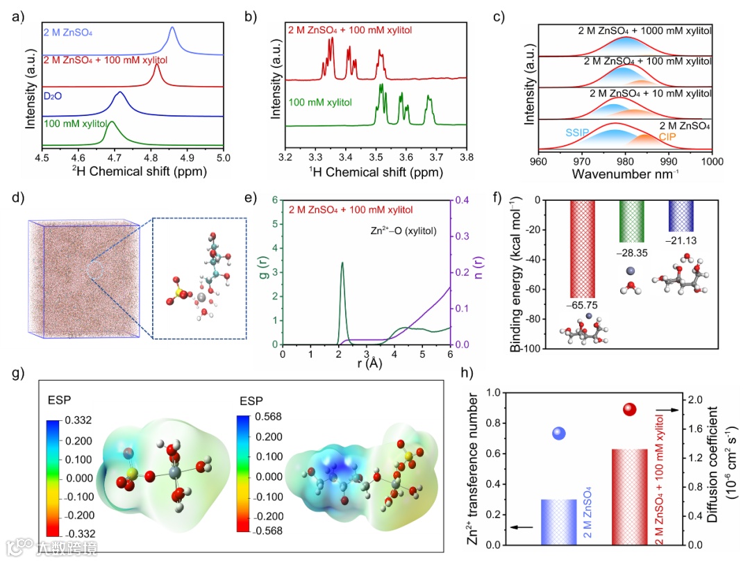 图2 (a) 纯D2O、2 M ZnSO4、100 mM木糖醇和含有100 mM木糖醇的2 M ZnSO4中H2O分子的2HNMR光谱。(b) 100 mM木糖醇和含有100 mM木糖醇的2 M ZnSO4中木糖醇分子的1HNMR光谱。(c) 不同木糖醇浓度下ZnSO4中SO42–的拉曼光谱。(d) 通过分子动力学模拟得到的ZnSO4-木糖醇电解质的三维快照和表示Zn2+溶剂化结构的部分放大快照;(e) 由分子动力学模拟计算的Zn2+-O(木糖醇)径向分布函数。(f) 不同物种(Zn2+、木糖醇和H2O)之间的结合能。(g) 原始Zn2+-5H2O-SO42–(左)和木糖醇-Zn2+-4H2O-SO42–(右)溶剂化结构的静电势图。(h)Zn2+迁移数和扩散系数比较。