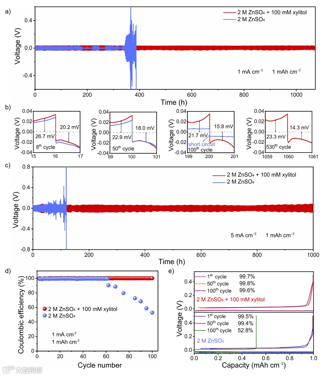 使用含木糖醇添加剂的Zn||Zn对称电池在1 mA cm−2和1 mAh cm−2下展现出超过1100 h的循环性能,明显优于纯ZnSO4电解质。同样地,Zn||Cu非对称电池也展现出99.8%的平均库伦效率,体现了优异的镀锌/剥离循环耐久性。