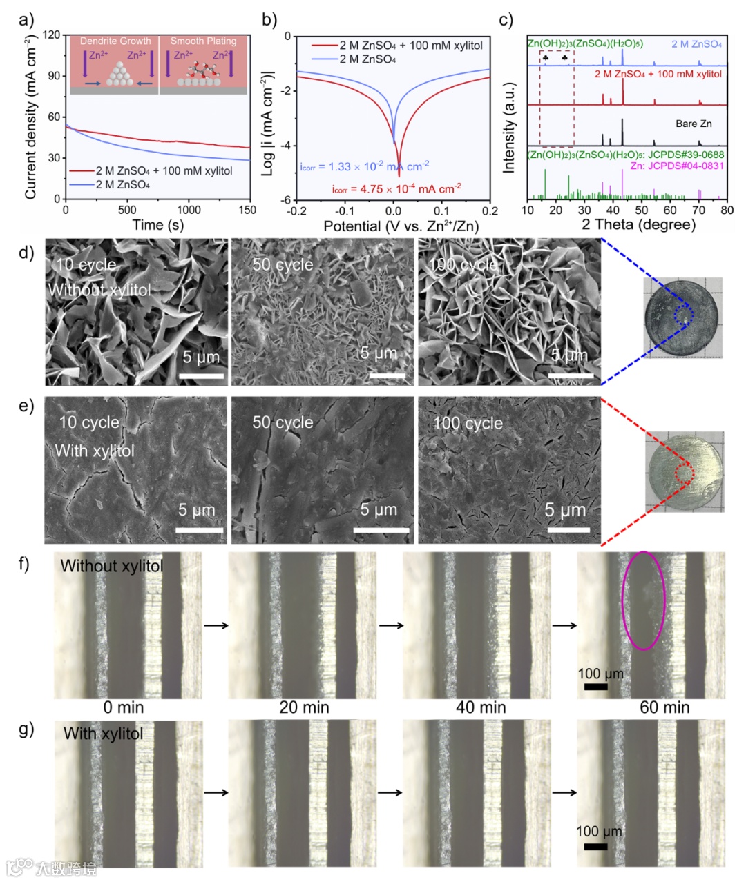 图5 (a) 使用不同电解质测试得到的锌负极的计时电流曲线。插图描述Zn2+扩散和沉积过程。(b) Tafel曲线。(c) Zn负极在不同电解质中循环前后的XRD图谱。在ZnSO4电解质中(d) 添加木糖醇和(e) 不添加木糖醇,锌负极的非原位扫描电镜图像,插图是循环前后锌箔的图像。在ZnSO4电解质中(f) 加木糖醇和(g) 不加木糖醇镀锌过程的原位光学显微镜图像。